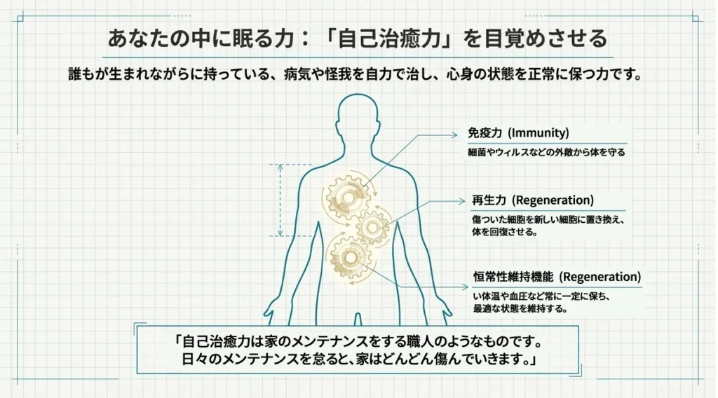 「からだ」自身の持つ自浄作用に身をゆだね、そのプロセスに深く感謝をし、少しでも快適な状態に近づけるように「からだ」の教えを素直に受け入れることが大切です。むしろ病気が自分の生活上の歪みを、気づかせてくれたことを喜ぶことです。